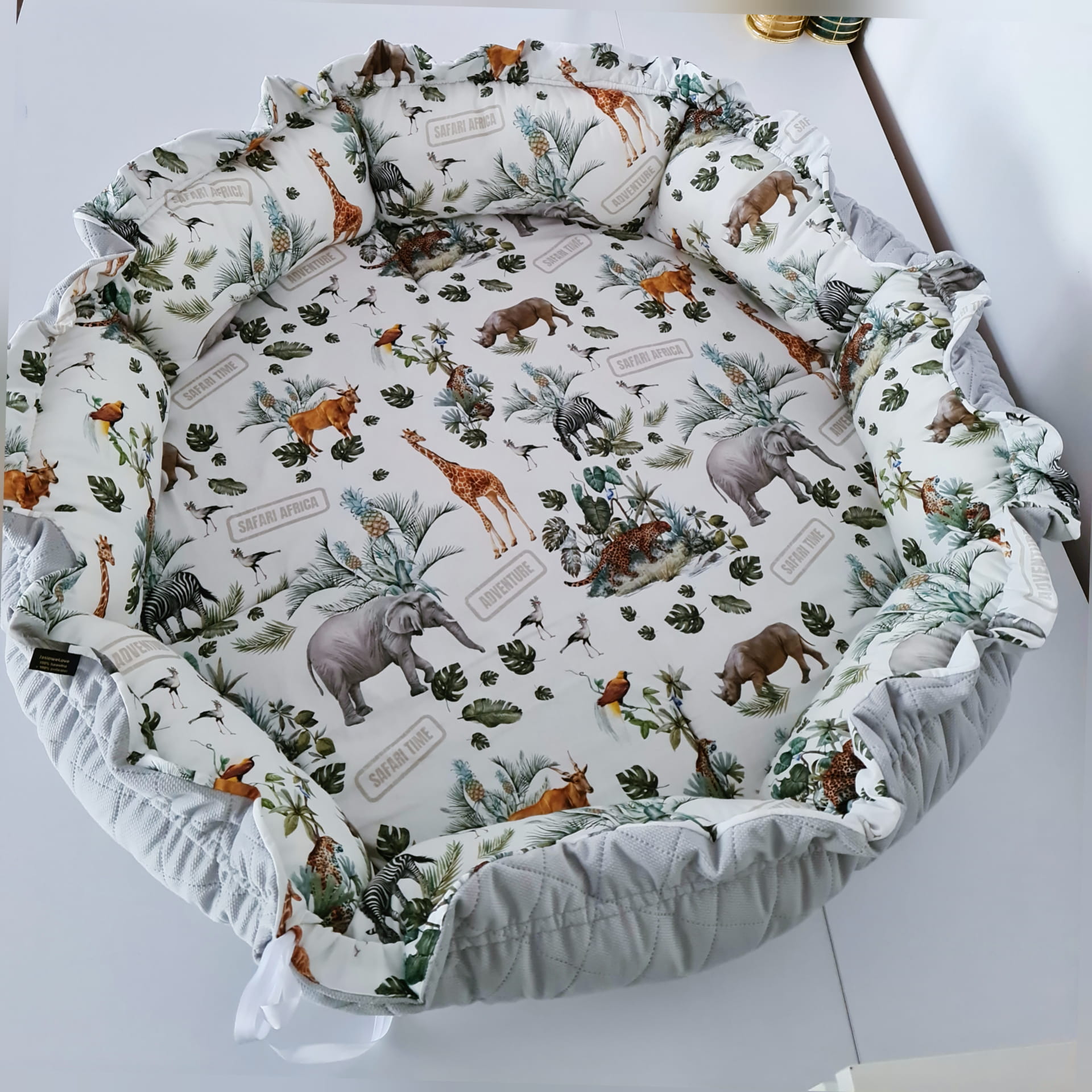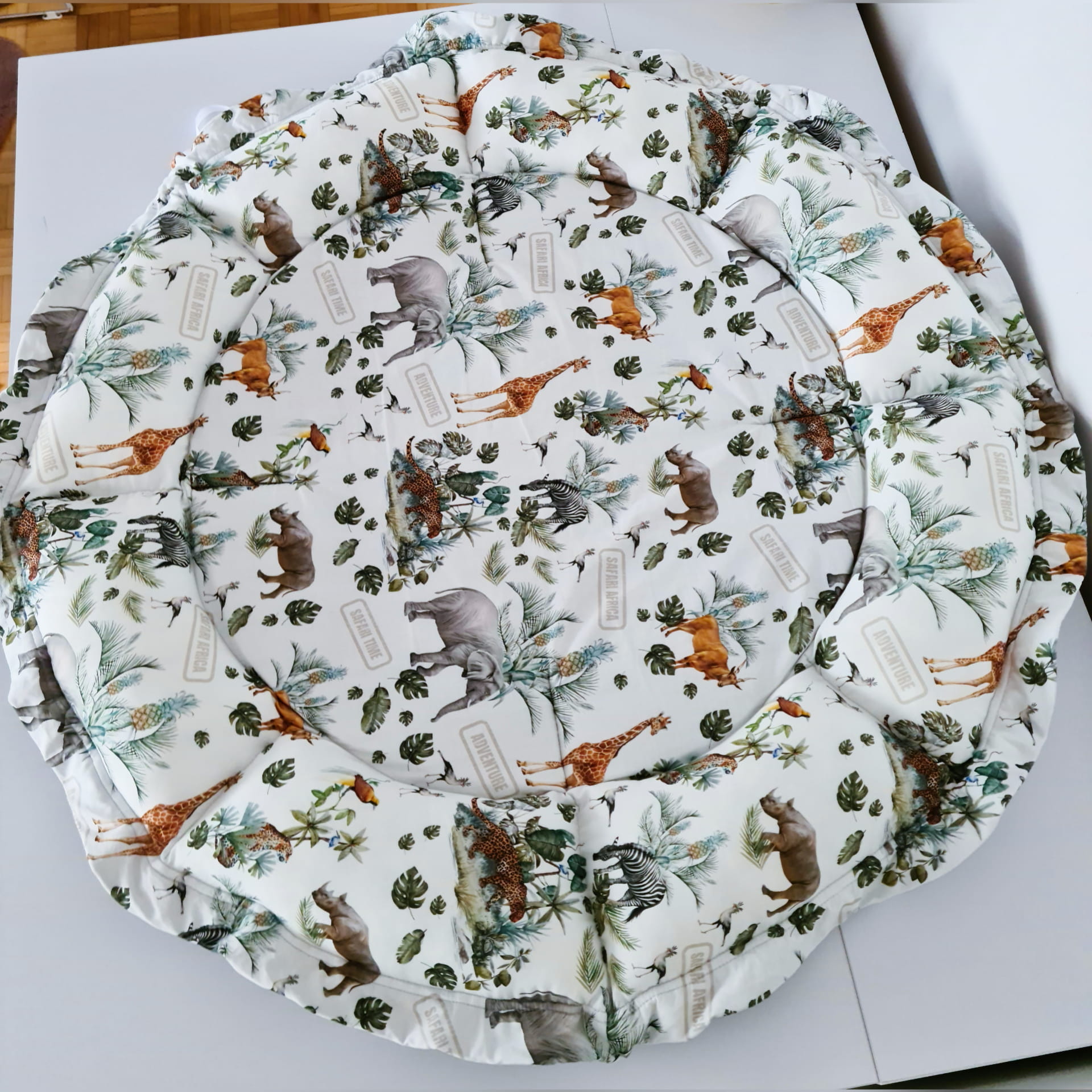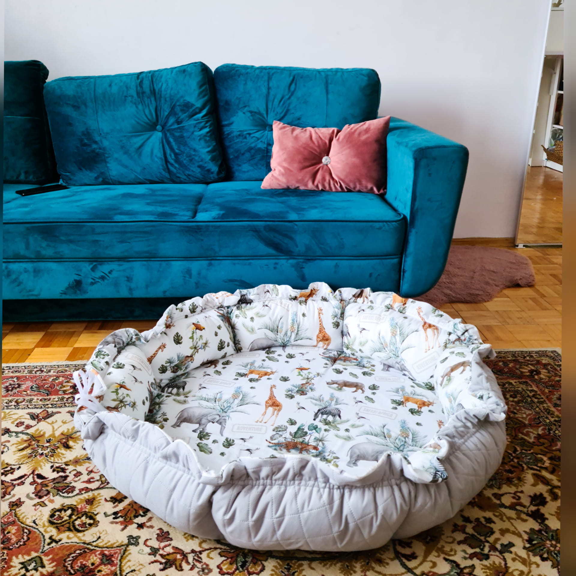 Mata wykonana dwustronnie z milutkiego pikowanego velvetu oraz bawełny premium. Wypełnienie z miękkiej wysokogatunkowej pianki oraz kulki silikonowej. Mata posłuży jako kojec do zabawy, a także schowek na zabawki po ściągnięciu.